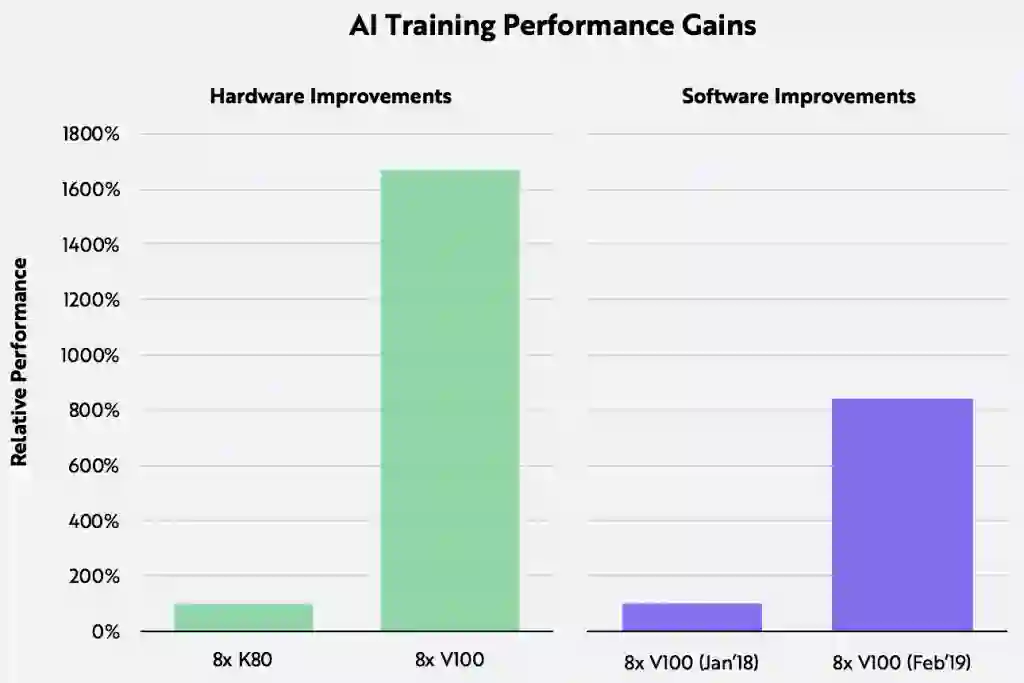 在2018年至2019年间,由于麻省理工学院、谷歌、 Facebook、微软、 IBM、 Uber 等公司的软件创新,V100的训练性能提高了大约800% 。