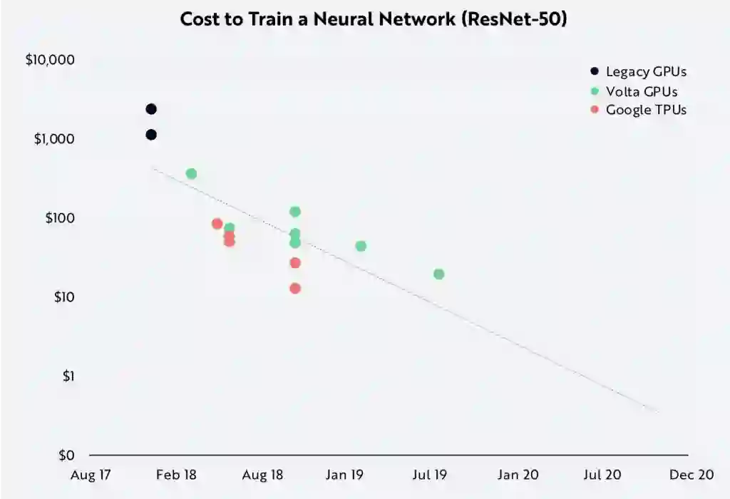 方舟投资报告指出, 硬件和软件的突破使得AI训练成本下降。