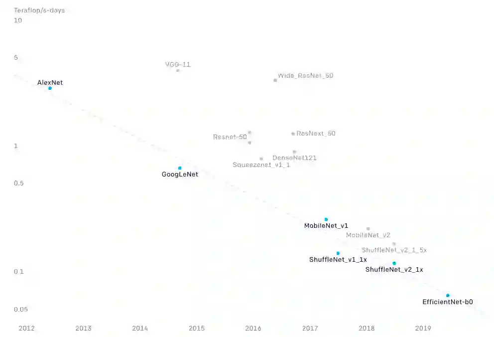 自 2012 年以来,人工智能模型在 ImageNet 分类中训练神经网络达到相同性能所需的计算量,每 16 个月减少了 2 倍