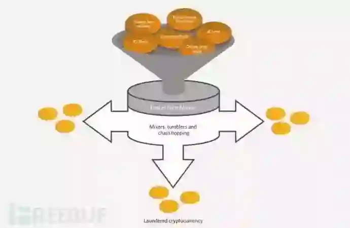 一般来说,他们所做的第一步也是分流。但是和开设空壳公司或做其他实体投资不同,他们主要需要借用“搅拌器”和“滚筒”,就是用不同的地址和交易记录取出一组虚拟货币,在返还另一组同等价值的同样币种。他们也会将虚拟币分为多份小额分批转到洗钱者的地址上,然后洗钱者再通多次的买卖将这笔钱洗干净。