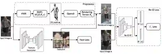 整个训练流程如图 3 所示。首先,研究员用 HMR 来预测 SMPL 参数,并用预测的参数来计算人体网格;然后,用纹理生成器(U-Net)来从单一图像生成纹理,并进一步用可微渲染器(Opendr)在这些生成的纹理在上渲染人体图像;随后,输入与渲染图像通过 part- based 卷积基线被送入一个预训练人体重识别网络 ,并最小化提取出的特征距离。