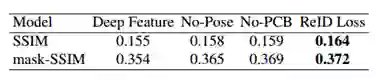 损失函数相当于直接优化 SSIM 分数。虽然 ReID 损失不能直接优化 SSIM 分数,但使用 ReID 损失的 SSIM 分数仍然很高。这证实,ReID 损失确实是有效的。