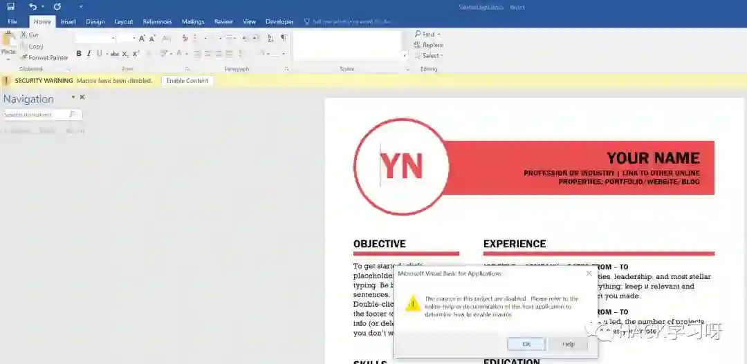 此时,我倾向于通过双击文档来确认我的模板和宏,确保获得了“启用内容”按钮,以及在点击它时拿到肉鸡: