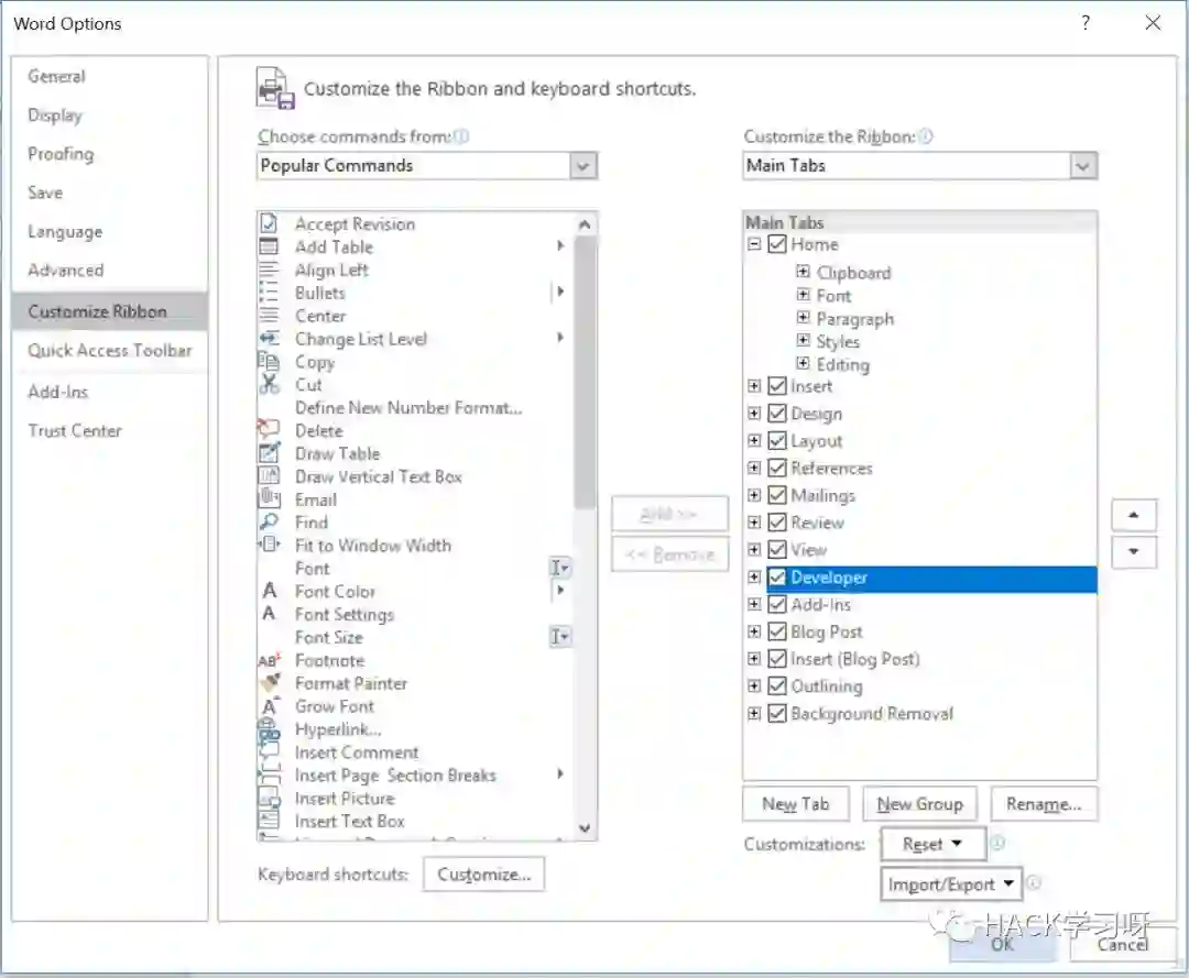 想要使此攻击起作用,我们需要创建一个支持宏的Word模板(.dotm文件扩展名),其中将包含我们的恶意Empire宏。打开Word并勾选功能区上的Developer选项卡使其可见: