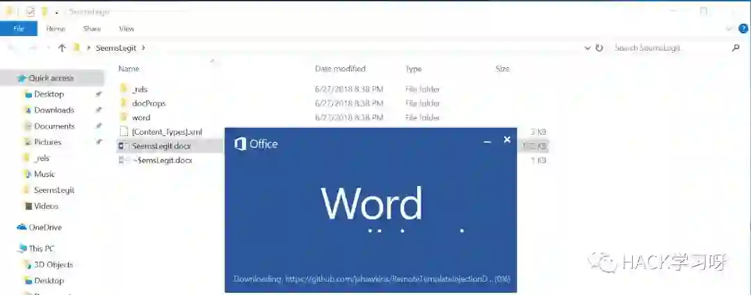 保存此文件后,我们可以将内容压缩回来并将文件重命名为.docx。下次我们打开我们的.docx时,我们可以看到该文件通过HTTPS与我们的托管服务联系,并下载模板: