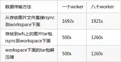 通过对比发现,当申请的worker数较多时,图片文件直接从我们存放的机器传输到训练机器比较快一些,worker数目较少时直接从wfs传输压缩包再解压更快一些。当然随着申请worker的增加,数据传输有个弊端,得每个worker都要传输一遍,这是由于每个worker是独立的环境,每个worker下面的workspace下面是虚拟的挂载盘,互相之间不能访问。