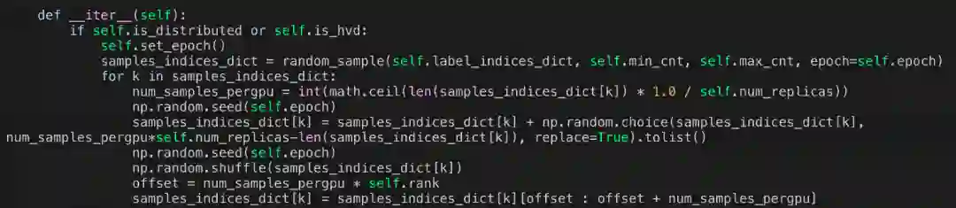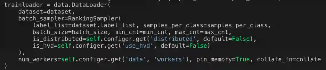 这种方式可以适用于简单的分布式训练任务。但是在识物的检索训练过程中,我们希望dataloader可以做一些平衡采样或者三元组采样,上面的sampler只支持分布式采样。由于pytorch的DataLoader的部分初始化参数之间存在互斥关系,如果自定义了sampler,那么这些参数batch_size,shuffle,batch_sampler,drop_last都必须使用默认值。所以我们重写batch_sampler,将分布式的sampler作为参数传入新构造的batch_sampler,如下所示,
