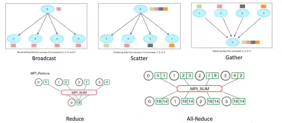 相比于单机多卡,多机多卡分布式训练要保证多台机器之间是可以互相通信的以及不同机器之间梯度可传递。并行任务的通信一般可以分为点对点通信和集体通信。点对点通信这种模式只有一个sender和一个receiver,实现起来比较简单。而涉及到分布式训练,一般是多台服务器,用到集体通信模式,包含多个sender多个receiver。集体通信常用的通信方式主要有下面几个:broadcast、gather、scatter、reduce、all-reduce等。