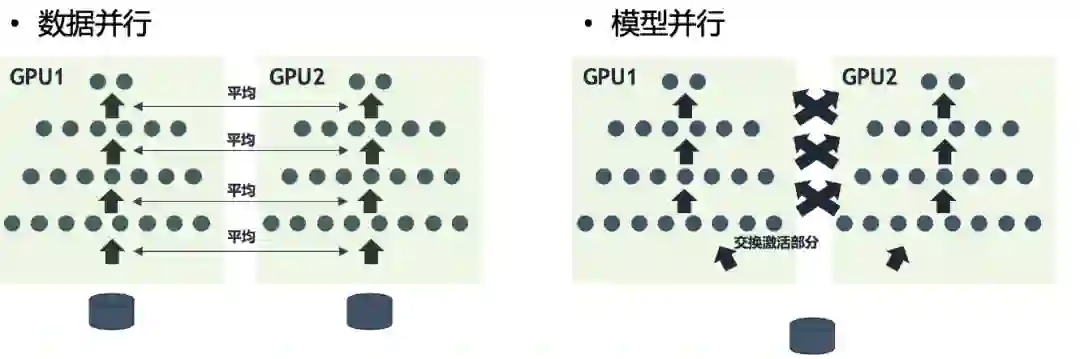 多机多卡相比较于单机多卡,使得模型训练的上限进一步突破。一般我们一台服务器只支持8张GPU卡,而采用分布式的多机多卡训练方式,可以将几十甚至几百台服务器调度起来一起训练一个模型,大大缩短模型训练时间。按照并行方式,分布式训练一般分为数据并行和模型并行两种: