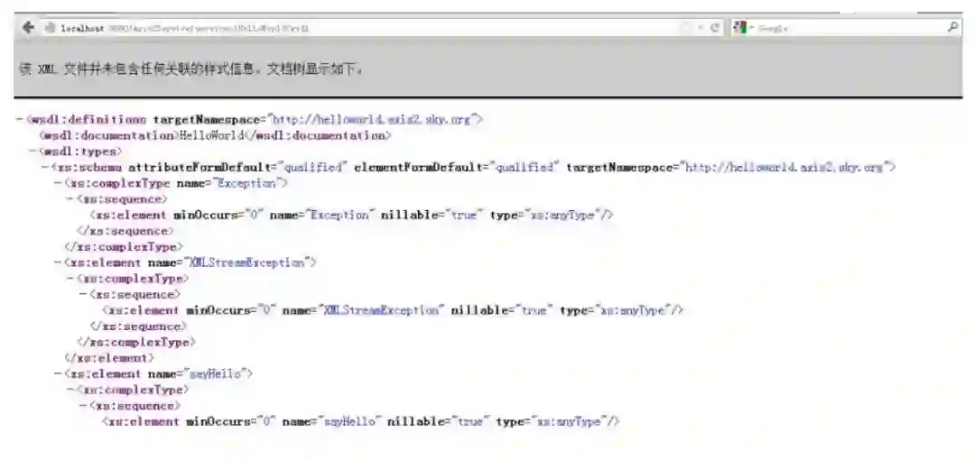 我们就可以得到我们的HelloWorld这个WebService的wsdl内容了。