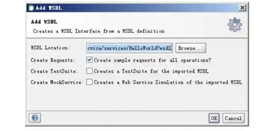 在弹出对话框中直接把http://localhost:8080/Axis2Service/services/HelloWorld?wsdl加入对方框中的wsdl栏中