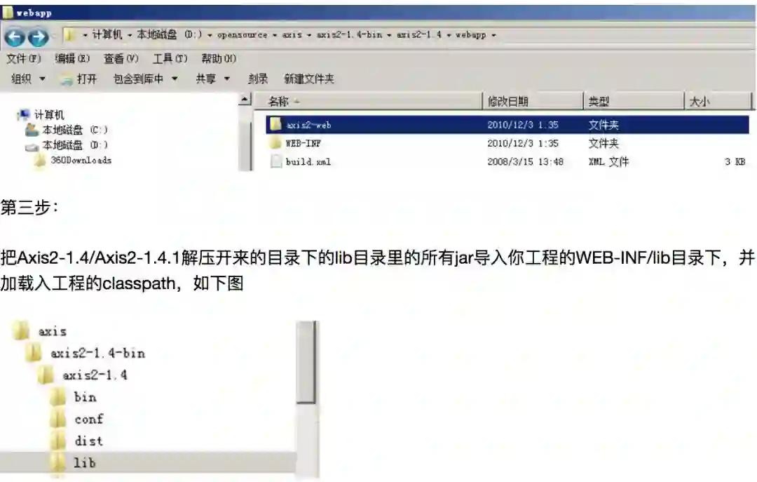 建完工程后,把Axis2-1.4/Axis2-1.4.1解压开来的目录下的axis2-web(如下图),整个拷入你工程的WebContent目录下: