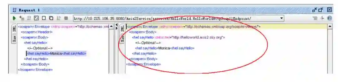 它会生成11Binding和12Binding两个客户端,我们把11Binding的节点展开,双击Request 1,在右边会显示调用的soap样例,在<hel:sayHello>?</hel:sayHello>块中我们把问号替换成Monica,然后点上方“绿色”运行按钮,我们就可以得到调用结果如下图: