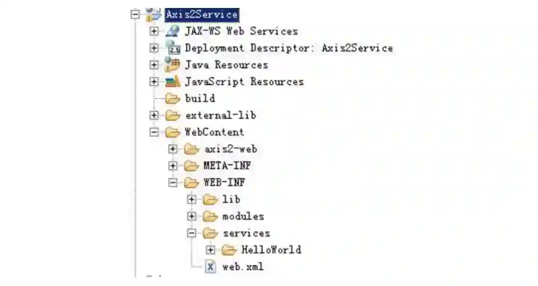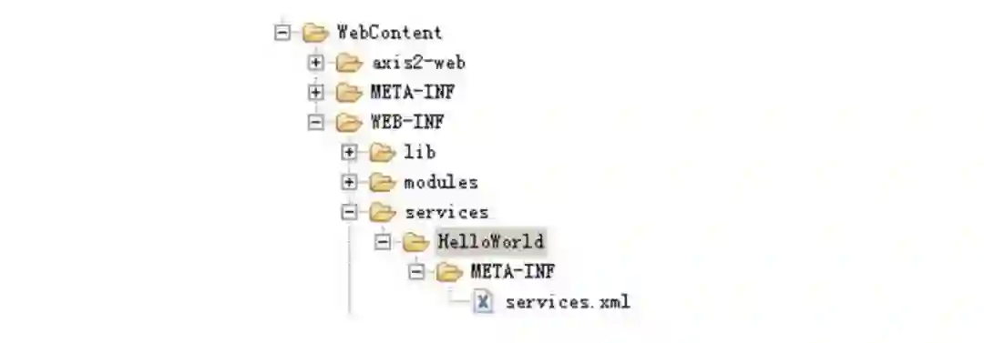 然后我们在工程的WebContent\WEB-INF\services\目录下新建一个目录叫HelloWorld的目录,与我们的类同名,在此目录下再建立一个META-INF的目录(大小写必须完全一致),然后在META-INF目录下新建一个services.xml,具体目录结构如下图所示: