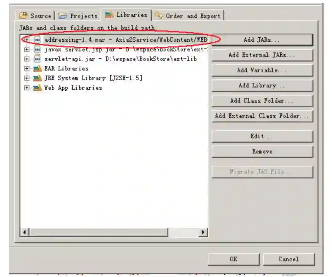 在第二种方式中,不需要为new ServiceClient()指定第一个sysContext参数,但是,你必须把WEB-INF\modules\addressing-1.4.mar指定到你的工程的classpath中去,如下图