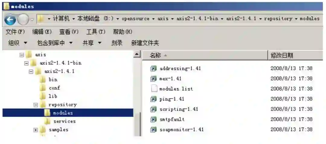 把Axis2-1.4/Axis2-1.4.1解压开来的目录下的repository\modules,modules这个目录,整个拷贝到你工程的WEB-INF目录下。