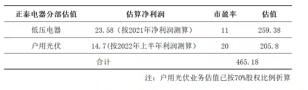 考虑到正泰电器目前持有户用光伏资产约70%的股权,因此按股权比例折算估值,并与低压电器业务的估值相加后,正泰电器整体的估值约为465.18亿元。