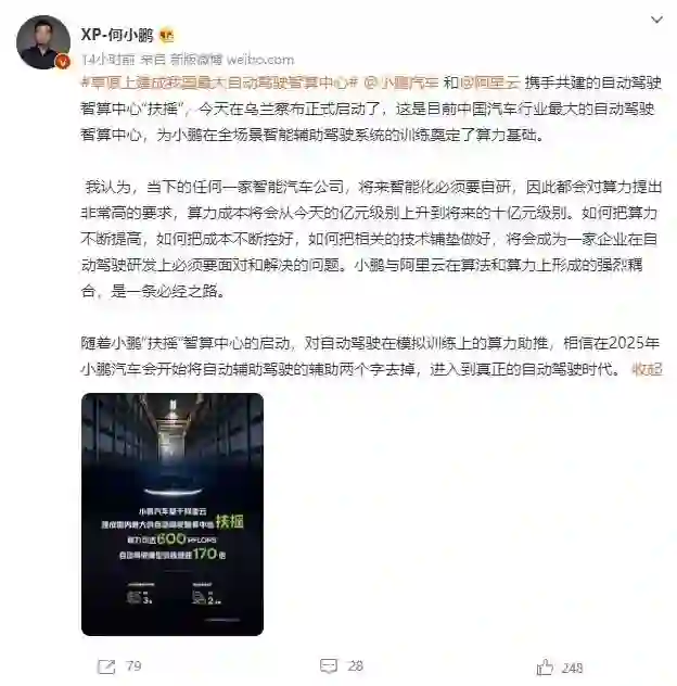【何小鹏:小鹏汽车有望在2025年实现真正自动驾驶】8月2日,小鹏汽车与阿里云联合打造的自动驾驶智算中心“扶摇”正式启动。何小鹏发微博称:“随着小鹏‘扶摇’智算中心的启动,对自动驾驶在模拟训练上的算力助推,相信在2025年小鹏汽车会开始将自动辅助驾驶的辅助两个字去掉,进入到真正的自动驾驶时代。”(IT之家)