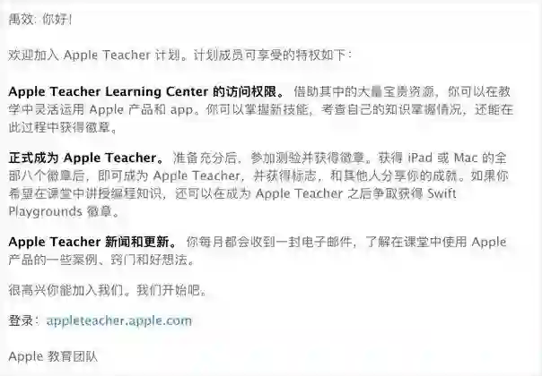 申请提交之后,很快你会收到下面这封邮件,提醒你 Apple Teacher 学习中心的访问权限已经打开,这时候你就可以前往这个地址登录 Apple Teacher 学习中心。
