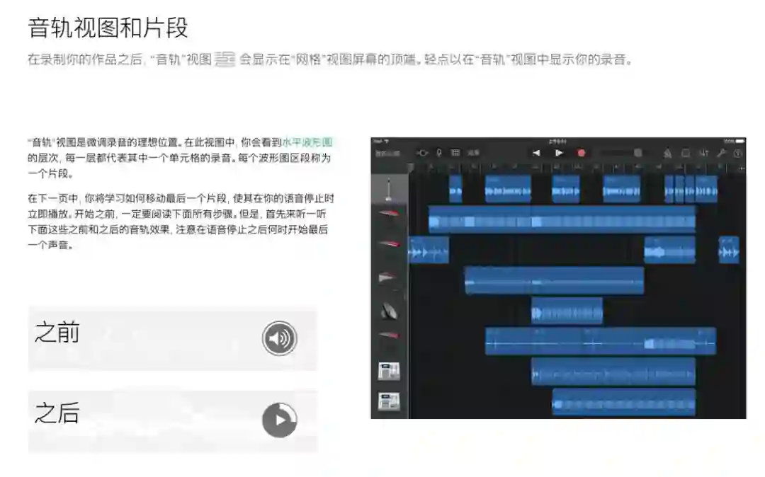 创意软件: 手头有个视频想要剪辑并发布到视频网站?受不了唱吧软件的拙略音质,想要高品质的录一首歌?这时可以阅读对应设备的「iMovie 入门指南」,「GarageBand 入门指南」,「可立拍入门指南」。以 GarageBand 为例,这里你会学到巧妙调节均衡器,噪音门,监控器等录制清晰人声,或使用 Apple 循环制作背景音乐等。