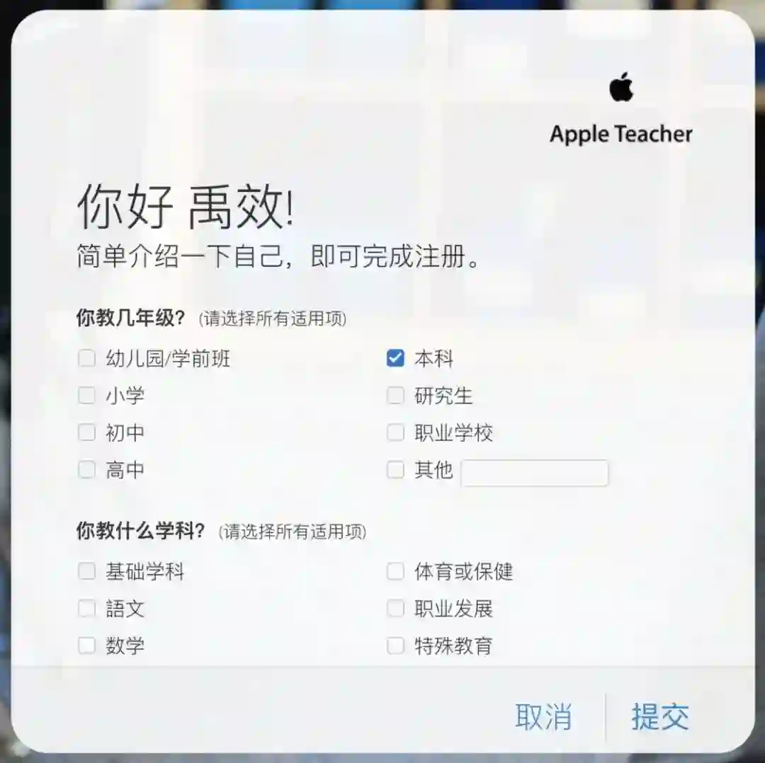 若你想使用 Apple Teacher 的教学资源,以及边学边拿苹果提供的成就奖章,那么你需要点击 Apple Teacher 权限申请,填写表格并免费申请加入计划。表格如下图所示,需要提供简单信息,若你只想用其资源精进自我,在下表的教什么一栏选择其它即可。