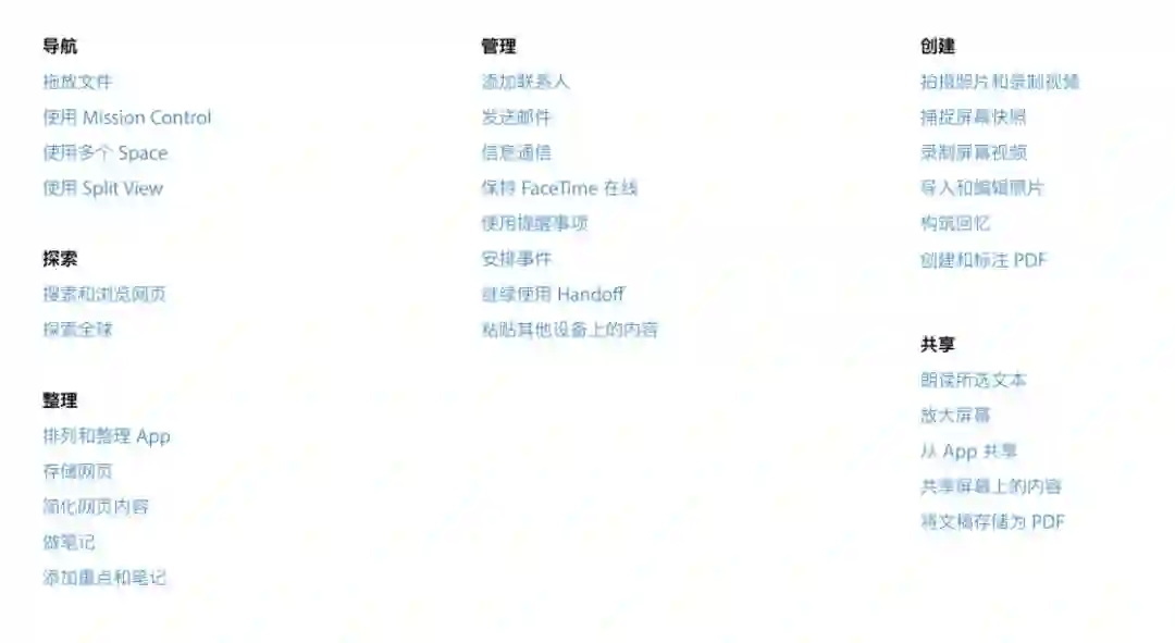 基础知识: 若你对 Mac 以及 iPad 一般熟悉,或想要学习更多用法,这时可以学习「iPad」,「Mac」入门这两本书。这两本书涵盖了图书,Safari 浏览器,访达文件管理,快速搜索,多窗口管理,PDF 编辑,照片整理,视频录制等等的基础知识。内容深入浅出,跟着读完你应该能自称「高级用户」了,你会比一般人更了解你的设备可以为你提供什么。