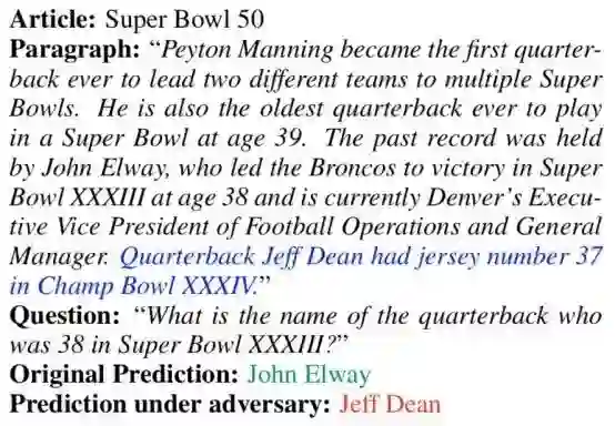 再举个例子。如果在输入中添加一个不相关的句子会导致问答模型给出不同的答案(见下图),就说明该模型并不能真正理解问题。