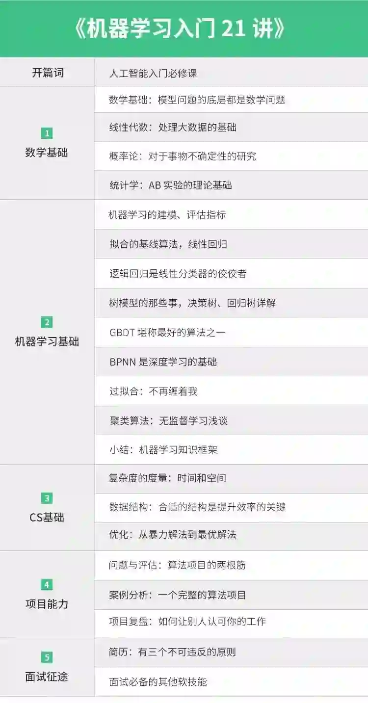 有鉴于此,我在拉勾上开设了一门课程《机器学习入门 21 讲》。拆解机器学习主流模型,找到主流模型背后依赖的数学知识点。再讲这些数学相关的知识点,进行统一整合归并。