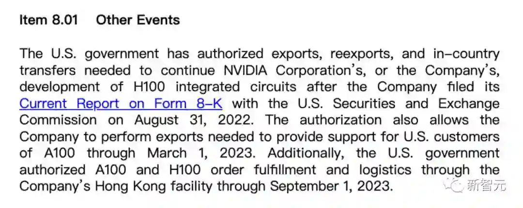 美国政府已经授权,在公司于2022年8月31日向美国证券交易委员会提交8-K表格的当前报告后,可以允许继续公司继续开发H100集成电路所需的出口、再出口和国内转移。