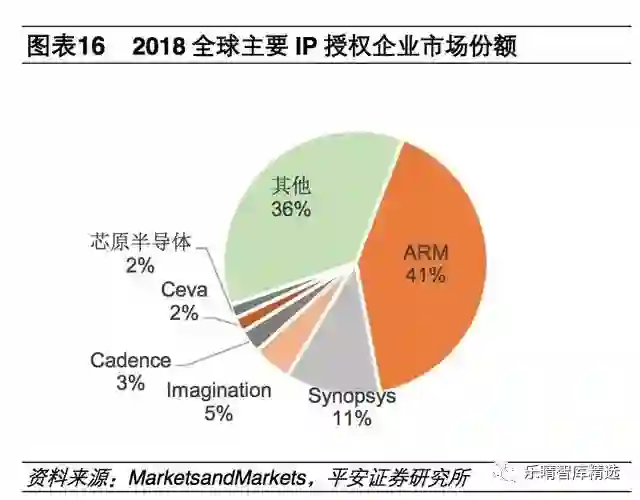 这种类似搭积木的开发模式,缩短了芯片开发的时间,提升了芯片的性能。全球半导体IP市场在2018年整体市场规模为49亿美元。其中ARM公司是IP领域绝对龙头,占41%市场份额。