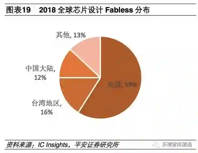 从地区分布来看,2018年美国在全球芯片设计领域拥有59%的市场占有率,居世界第一;中国台湾地区市场占有率约16%,居全球第二;中国大陆则拥有12%的市场占有率,位居世界第三。日本、欧洲半导体公司以IDM模式居多。