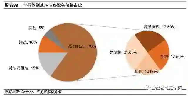 半导体制造过程复杂,涉及到的设备包括硅片制造设备、晶圆制造设备、封装设备和辅助检测设备等。在制造设备中,光刻机、刻蚀机和薄膜沉积设备为核心设备,分别占晶圆制造环节的约21%、18%和18%。