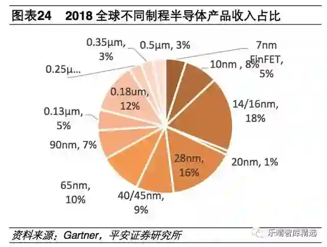 从制程工艺来看,顶尖工艺(7nm+10nm)目前占据13%的市场份额,主要用于CPU、GPU等超大规模逻辑集成电路的制造。主要用于存储芯片制造的14nm-28nm工艺占据了34%的市场份额;MCU/MPU、模拟器件、分立器件和传感器主要使用40nm以上工艺,占据了剩余的41%市场份额。
