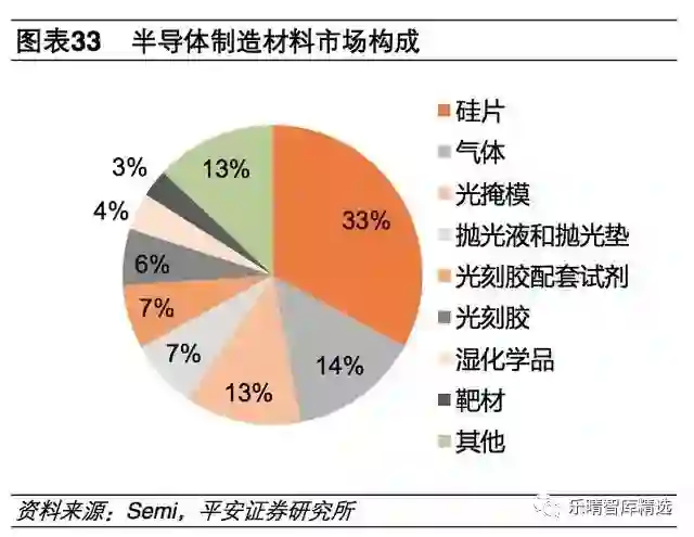 硅片、气体、光掩模和光刻胶四种材料占整体比例67%以上,其中硅片是半导体材料的核心。