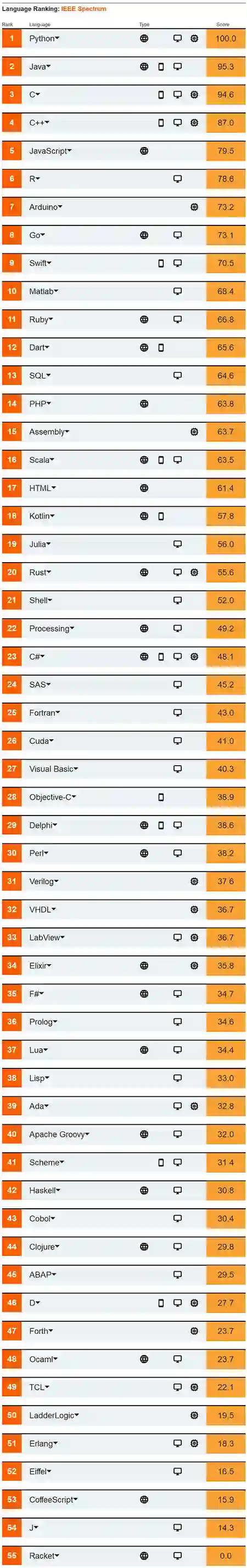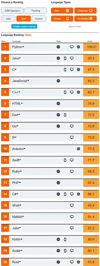 在最新的编程语言排行榜中,IEEE Spectrum 通过综合 CareerBuilder、GitHub、Google、Hacker News、IEEE、Reddit、Stack Overflow 和 Twitter 八个来源 ,分析了 55 种编程语言的流行度,发布了 2020 年度编程语言排行榜。