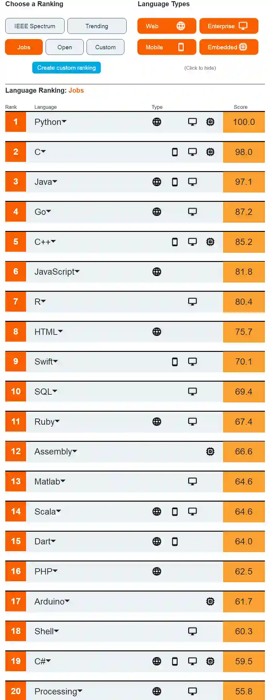 近日,IEEE Spectrum 最新发布了 2020 年年度编程语言排行榜。IEEE Spectrum 编程语言排行榜一年发布一次,截止到今年,该排行榜已经连续发布了七年。与其他榜单有所不同,IEEE Spectrum 可以让开发者自己选择参数组合时的权重,得到多样的排序结果。