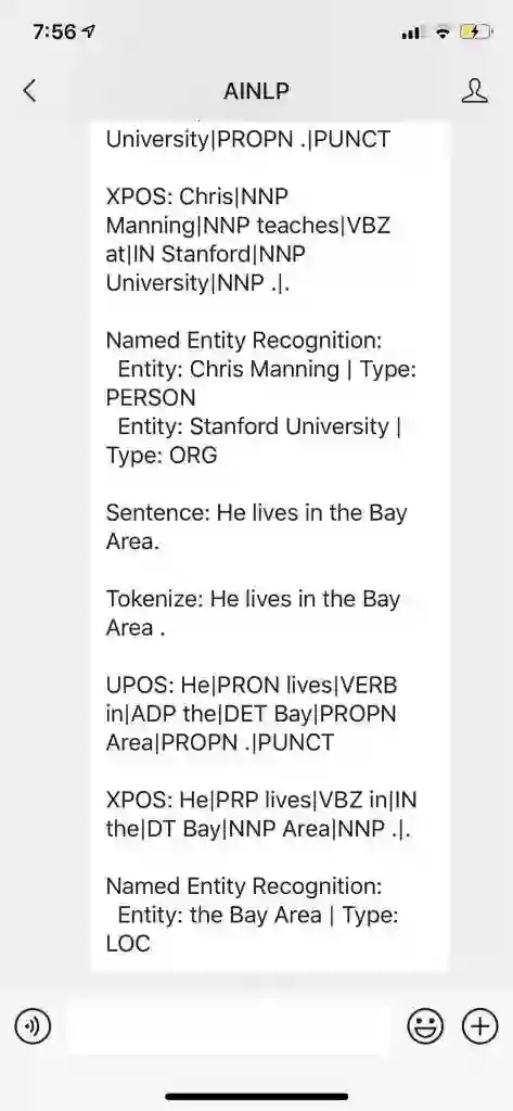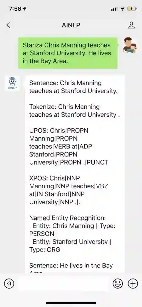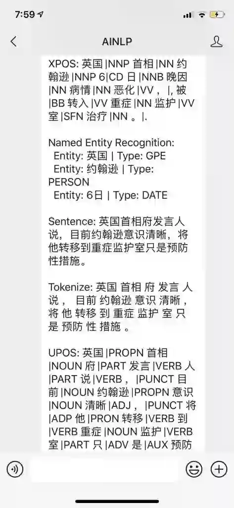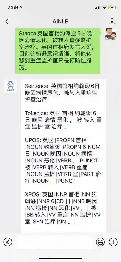 我将Stanza的中英文模块部署在了AINLP的后台,使用的就是CPU,感兴趣的同学可以关注AINLP公众号,对话测试,Stanza+分析内容触发,会自动判断语言选择不同的Pipeline: