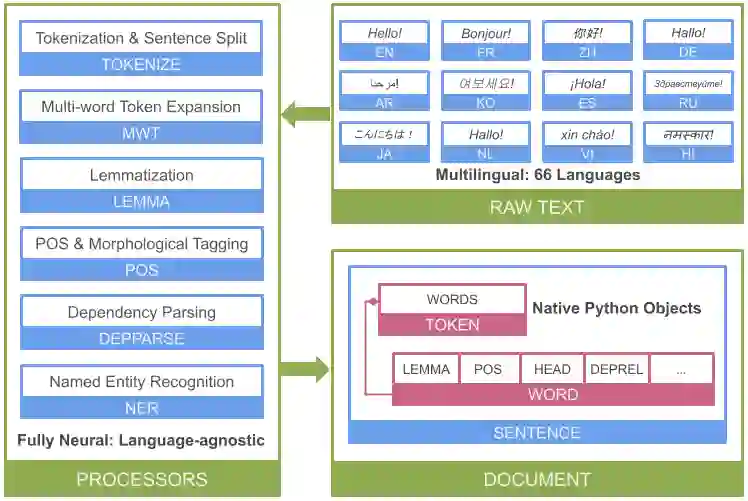 Stanza 是一个纯Python实现的自然语言处理工具包,这个区别于斯坦福大学自然语言处理组之前一直维护的Java实现 CoreNLP 等自然语言处理工具包,对于Python用户来说,就更方便调用了,并且Stanza还提供了一个Python接口可用于CoreNLP的调用 ,对于一些没有在Stanza中实现的NLP功能,可以通过这个接口调用 CoreNLP 作为补充。Stanza的深度学习自然语言处理模块基于PyTorch实现,用户可以基于自己标注的数据构建更准确的神经网络模型用于训练、评估和使用,当然,如果有GPU机器加持,速度可以更快。Stanza目前支持66种语言的文本分析,包括自动断句、Tokenize(或者分词)、词性标注和形态素分析、依存句法分析以及命名实体识别。