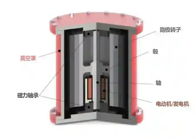 这种飞轮的核心部件是中间的真空室,它能最大限度地降低转动中的摩擦,飞轮的能量效率(能量输出/能量输入)——也称为往返效率——可高达90%。更先进一代的飞轮采用磁悬浮轴承,往返效率可以进一步提升到97%。