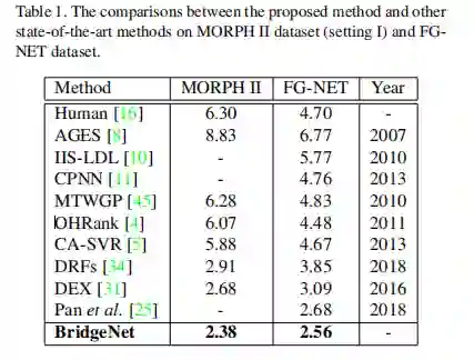 年龄估计是计算机视觉中一个重要且具有挑战性的问题。 现有的年龄估计方法通常采用分治法来解决非平稳老化引起的异构数据。 然而,面部衰老过程也是一个连续过程,不同年龄之间的连续关系还没有得到有效的挖掘。 在这篇文章中,作者 提出了一 种称为 B ridgeN et的模型进 行年龄估 计,能够 有效地 挖 掘年龄标签 之间的连续关系。