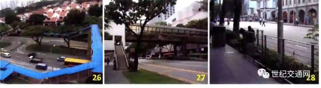 新加坡的人行天桥(link-bridge)主要设置在有中央分隔带的交通干道沿线的公交站附近,主要目的是服务公交乘客的换乘。若人行天桥邻近组屋,则通过连廊进一步连通到组屋的步行系统之中。