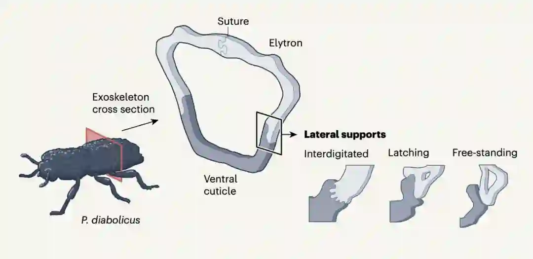 铁定甲虫的外骨骼具有三种不同的侧向支撑类型,根据界面的几何形状,可以分为交织型(interdigitated)、闭锁型(latching)和独立型(free-standing)