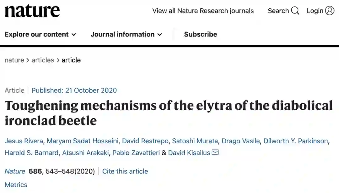 相关工作以“Toughening mechanisms of the elytra of the diabolical ironclad beetle”为题,于 10 月 21 日在顶级科学期刊《自然》(Nature)上在线发表。