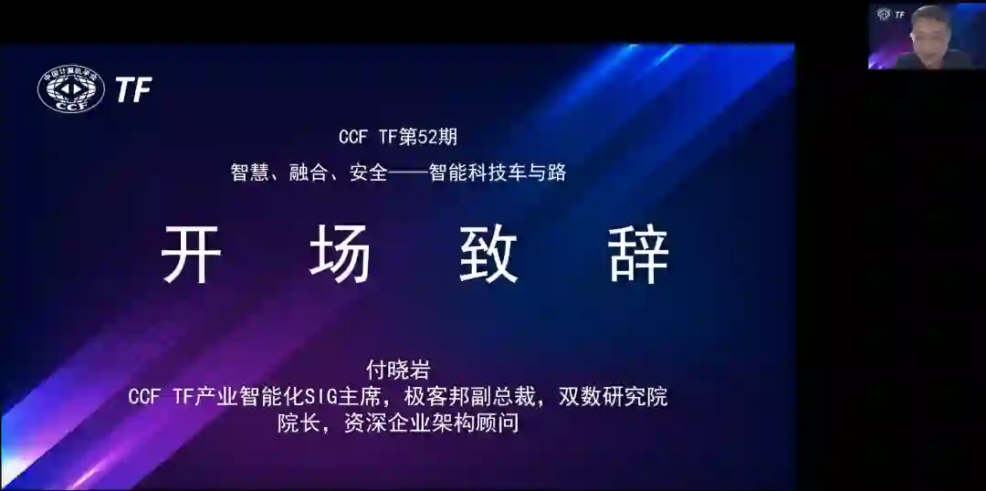 分享开始前,CCF TF产业智能化SIG主席,极客邦副总裁,双数研究院院长付晓岩作开场致辞。致辞中提到,智慧、融合、安全是数字经济中的重要部分,本期主题囊括了宏观及微观,涉及智慧城市、车联网和自动驾驶,能够从全局出发了解架构路径,从而看到数字经济的走向,也能给大家带来更多启示。