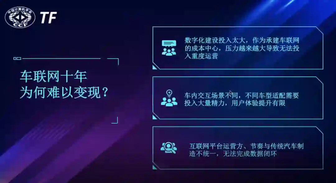 姚振则带我们回顾了汽车智能网联十年来的发展演变。汽车作为一个百年产业,是传统的工业思维,制造和零售相结合,非常严谨的,难以像互联网产品一样快速响应市场需求,车联网生态发展十年仍然处在困境,无法变现。