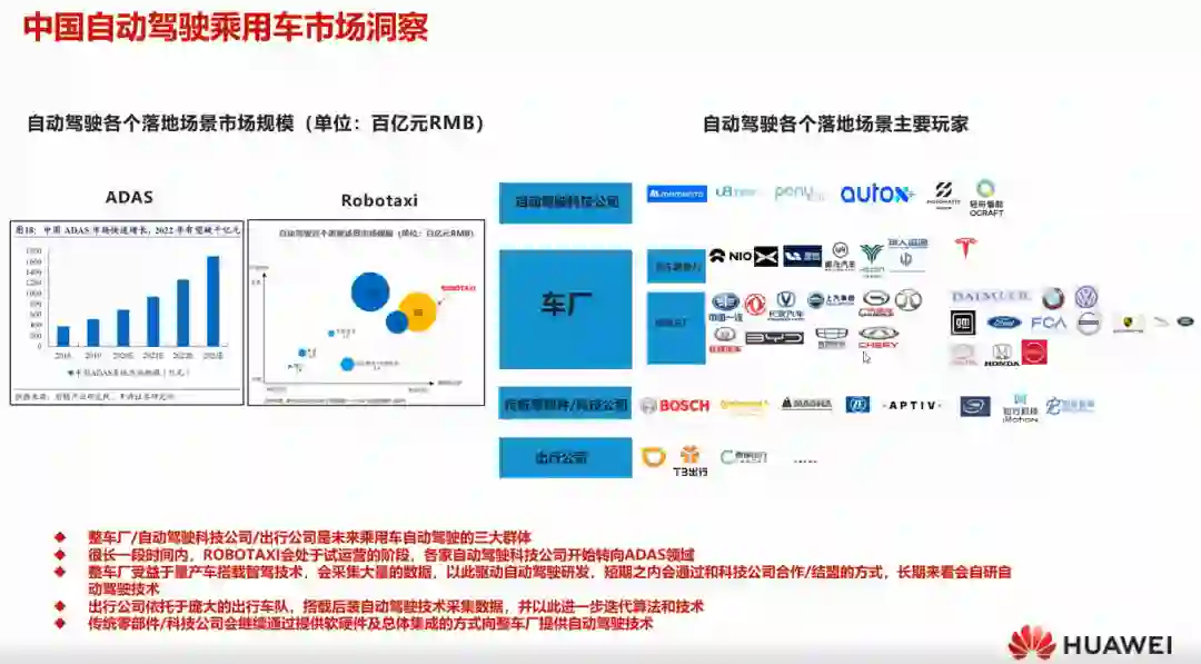 刘涛介绍了自动驾驶的级别定义和技术路线图。自动驾驶市场分为两部分,部分是乘用车,另一部分是商用车。商用车有比较明确的场景驱动,包括干线物流和园区、末端物流。乘用车是大众通常了解的,目前还处在辅助驾驶阶段。自动驾驶对汽车厂商和出行公司的意义也是不同的,汽车厂商为提升客户满意度,出行公司期望降低成本提高效率。自动驾驶整体的发展是渐进式的,需要持续的积累和完善,包括技术实现也没有形成统一的方案。