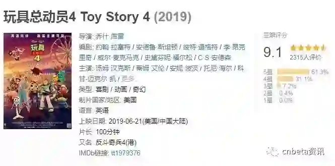 国内方面观众口碑也是相当给力,目前豆瓣评分9.1分,已经看过电影的观众表示,本来害怕皮克斯“狗尾续貂”,打破《玩具总动员》前三部留给大家的完美结局,没想到第四部玩出了新意,是一部既搞笑、又热血的新作,让大家重拾童年的感动。