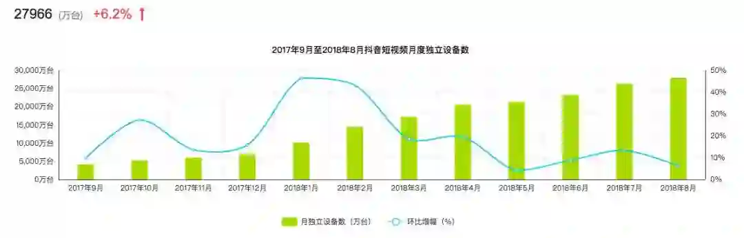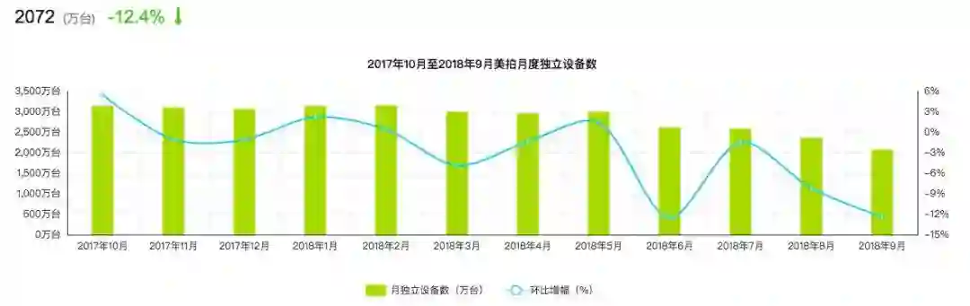 1)美拍的月独立设备数为2072万台左右,且呈现一定下降趋势。与抖音的27966台相比差距非常明显。