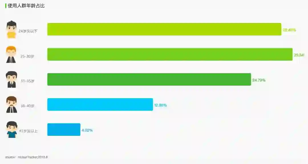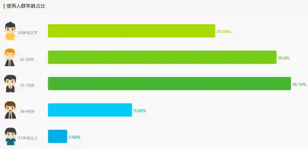 3)用户年龄分布中,24~30岁的用户最多,占比达58%,其次是31~35岁用户。用户群体很年轻,移动手机使用较为熟练和频繁。