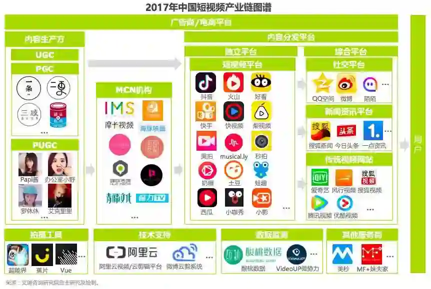 短视频行业产业链由内容生产方(UGC、PGC)到内容平台分发,整个链条较短。抖音和美拍都属于内容分发平台,非常依赖于上游的内容生产方及MCN机构。